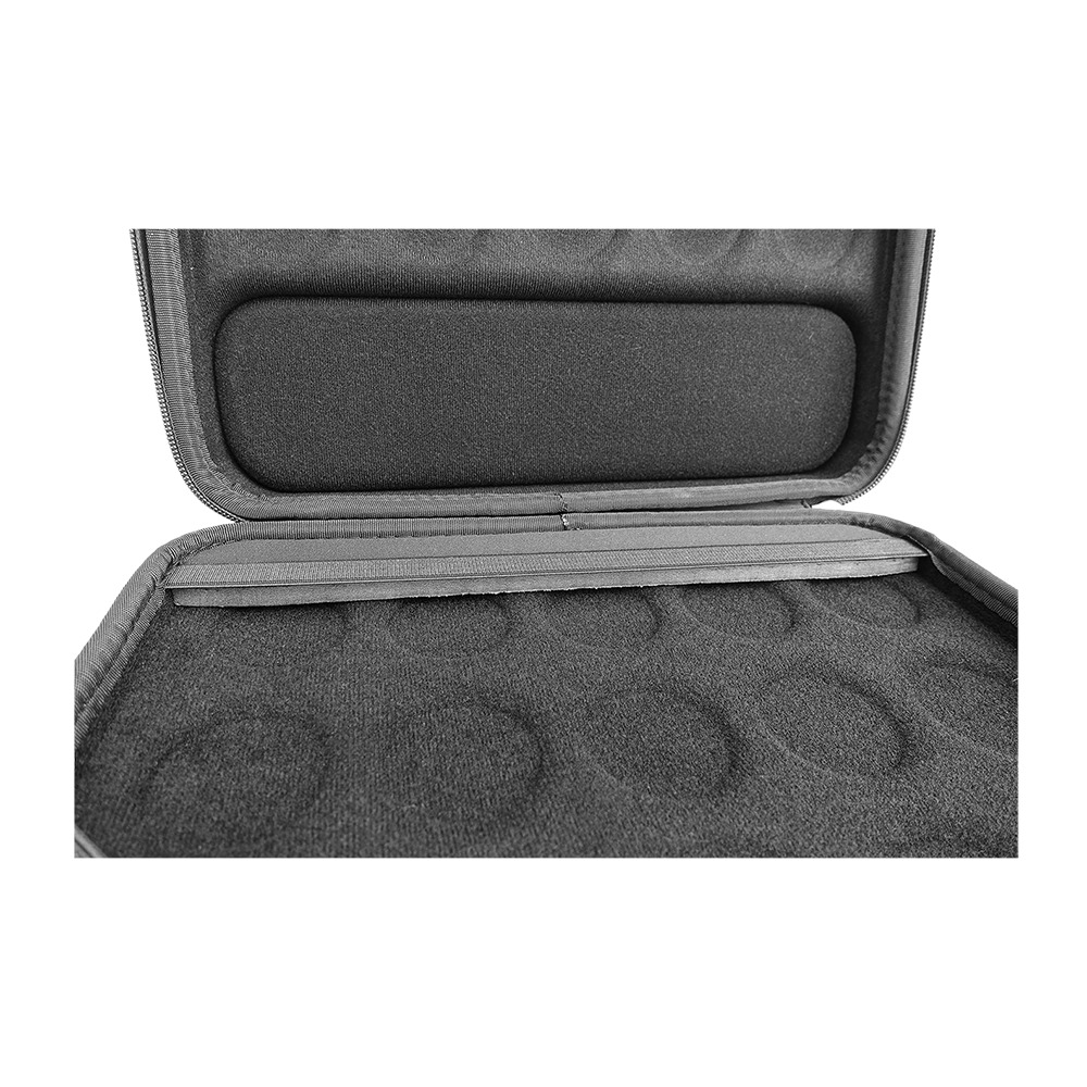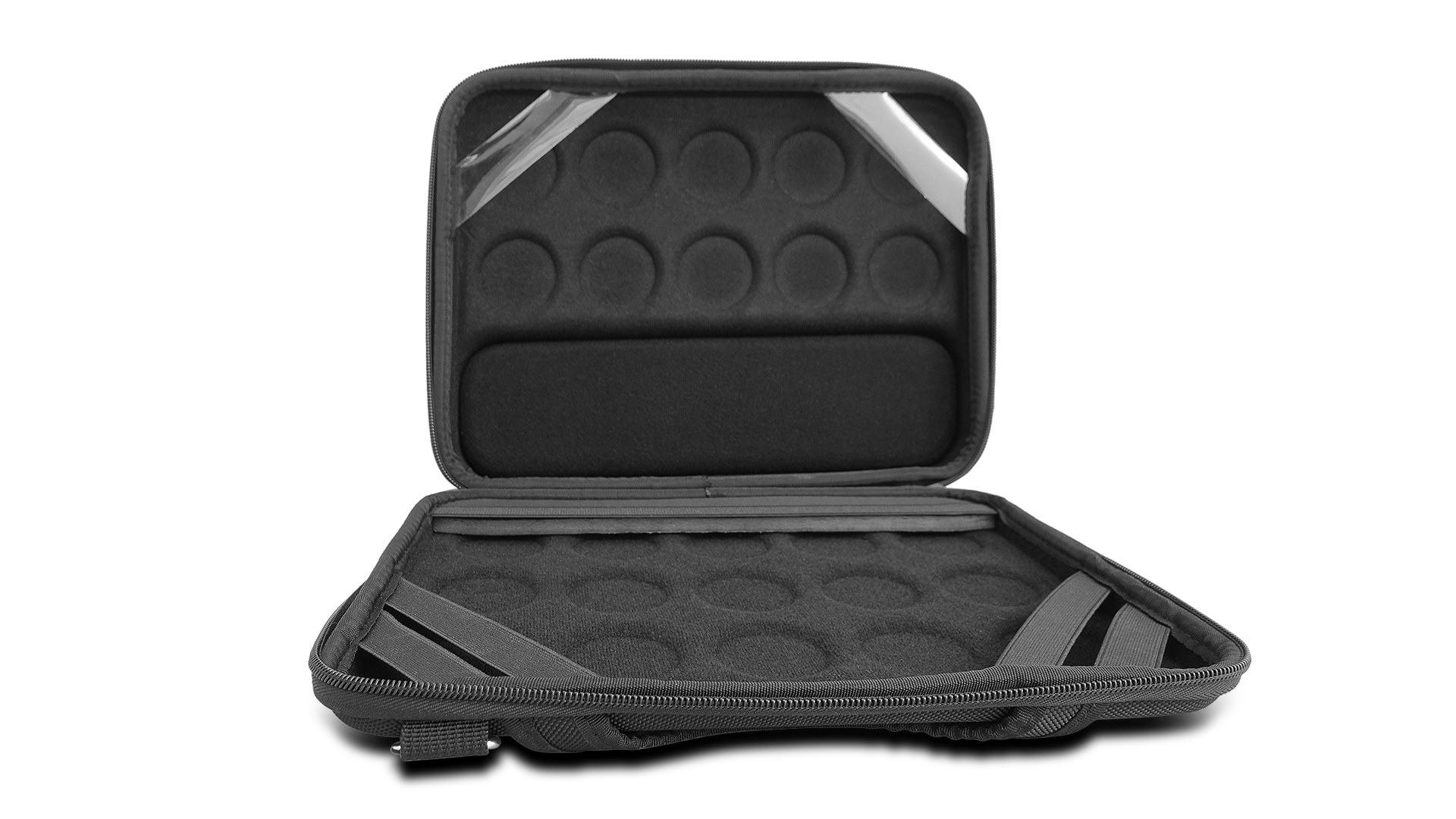 A tough rugged exterior and the soft microfiber interior absorbs impact. The dimpled interior improves air circulation to keep the device cool.  Adjustable shoulder strap and handle make the case easy to carry by hand, while the zipper closure keep damaging items out. Built-in charger storage area